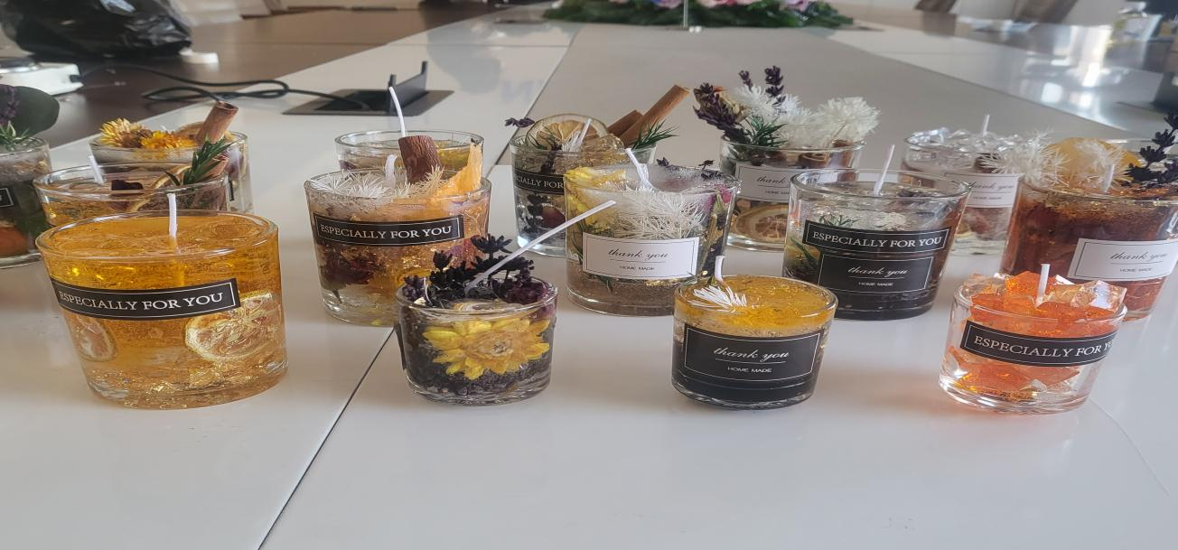 大家充分發(fā)揮創(chuàng)造力,經(jīng)過近一個小時的精心制作,一份份獨特的、充滿創(chuàng)意的香薰蠟燭完美的展現(xiàn)在我們面前。作品中香薰造型各異,也代表著大家不同的心境與體驗,鮮亮的橙色、清新的綠色、淡雅的白色,花立于杯中,或安靜或灑脫,給人以美的享受。